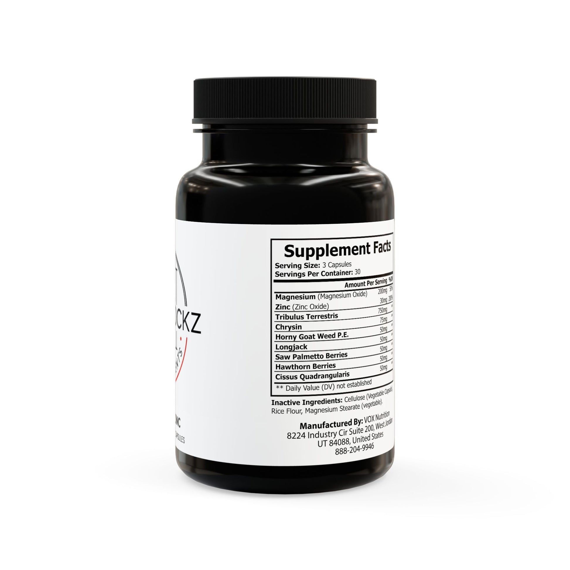 Ingredients: Magnesium (Magnesium Oxide), Zinc (Zinc Oxide), Tribulus Terrestris, Chrysin, Horny Goat Weed P.E., Longjack, Saw Palmetto Berries, Hawthorn Berries, Cissus Quadrangularis. Inactive Ingredients: Cellulose (Vegetable Capsule), Rice Flour, Magnesium Stearate (vegetable).